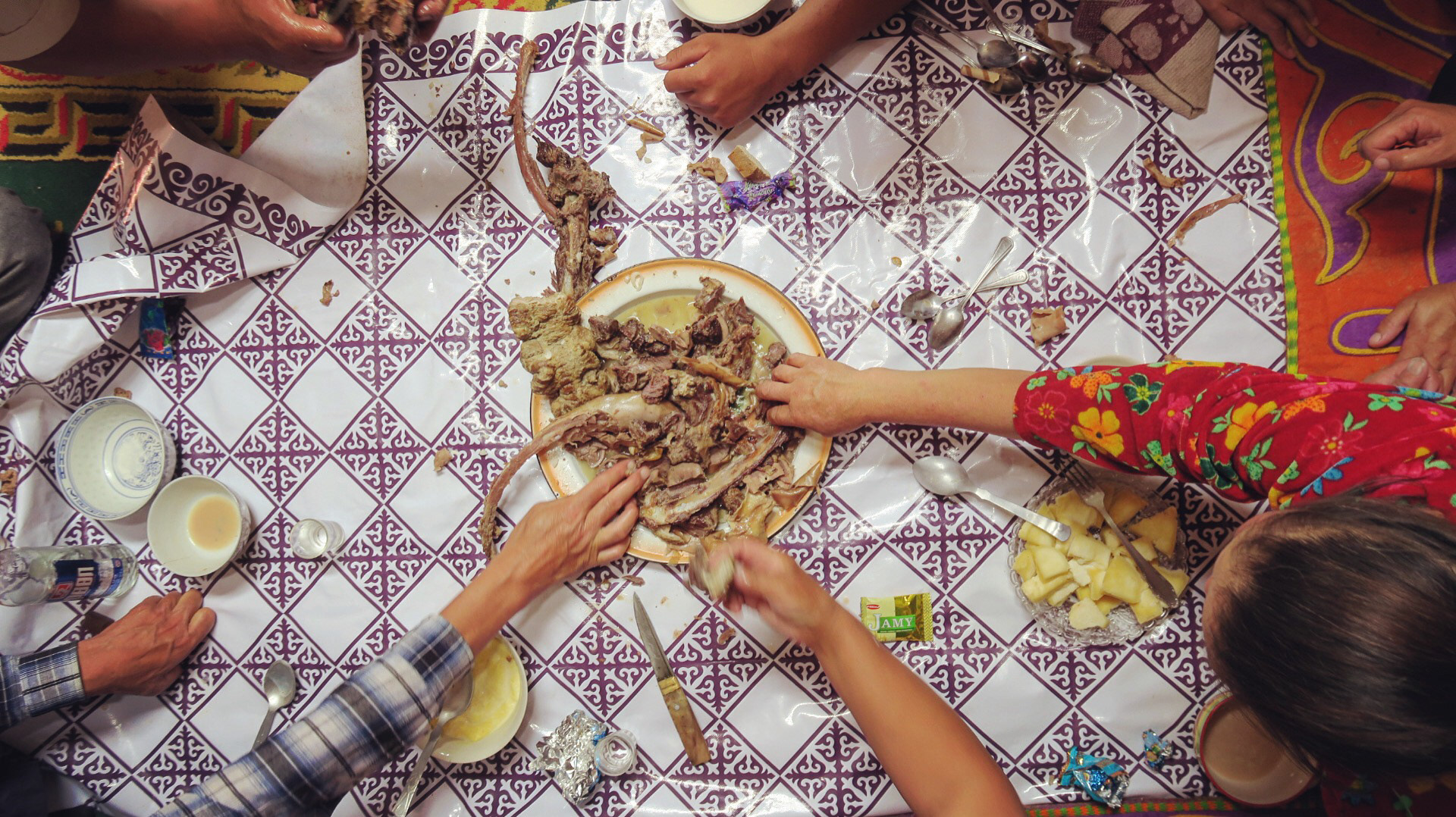 My new home is richly decorated with insulating felt wool stripes, the vertical surfaces are refined with geometric motifs of colorful threads, embroidered curtains can be pulled around the bed at night, this is the only way to separate the space shared by an entire family. The centre of the ger is where social life happens. By the stove, sitting on rugs around the little table, we drink tea several times a day.